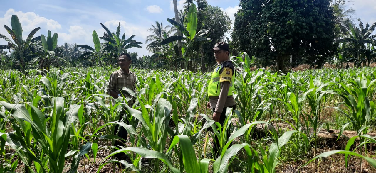 ANGGOTA BHABINKAMTIBMAS POLSEK BP PELIUNG MENDUKUNG PROGRAM PANGAN NASIONAL DENGAN RUTIN MELAKUKAN GIAT KONTROL PERKEMBANGAN PERTUMBUHAN TANAMAN JAGUNG