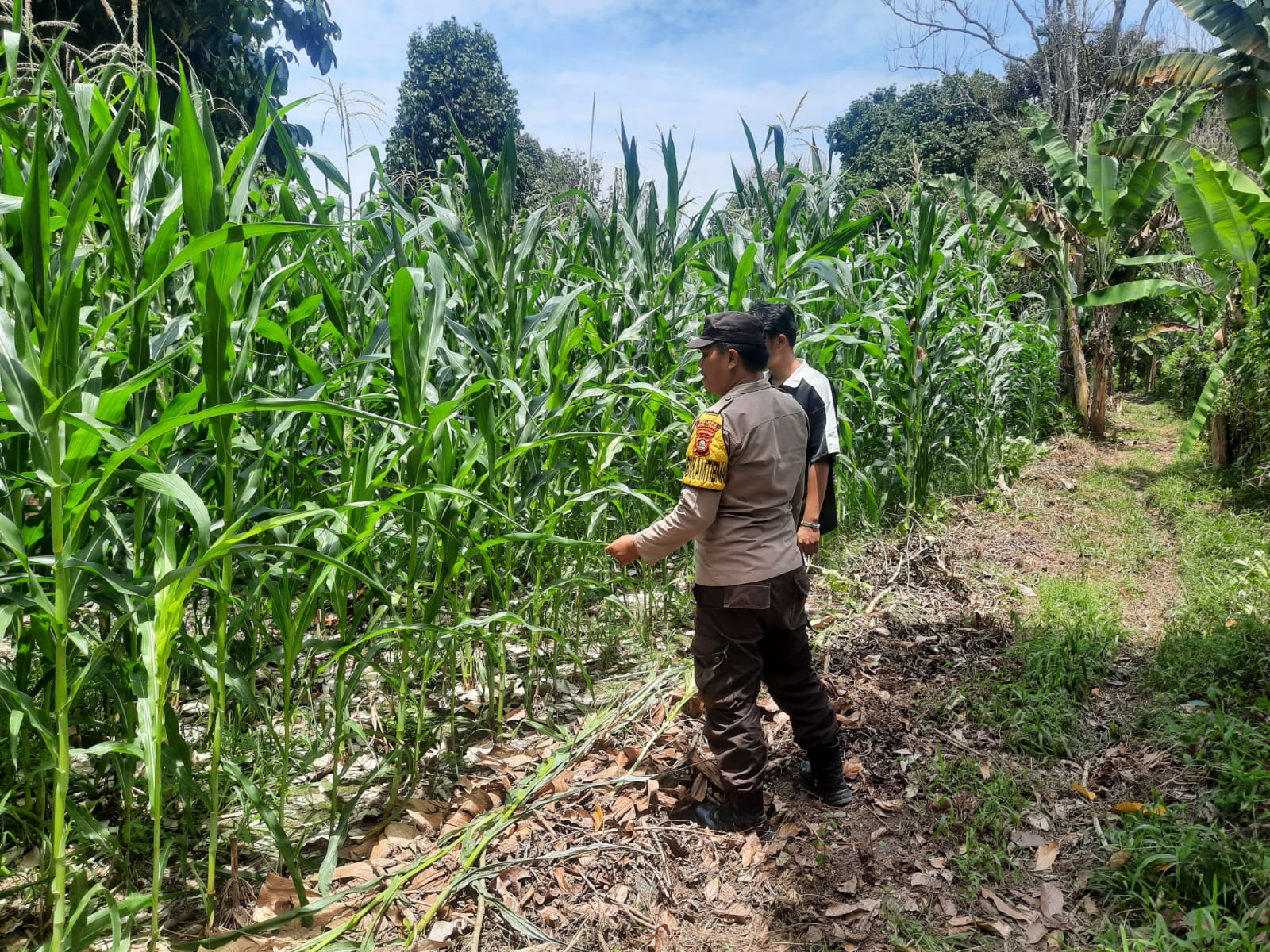 ANGGOTA BHABINKAMTIBMAS POLSEK BP PELIUNG MENDUKUNG PROGRAM PANGAN NASIONAL DENGAN RUTIN MELAKUKAN GIAT KONTROL PERKEMBANGAN PERTUMBUHAN TANAMAN JAGUNG