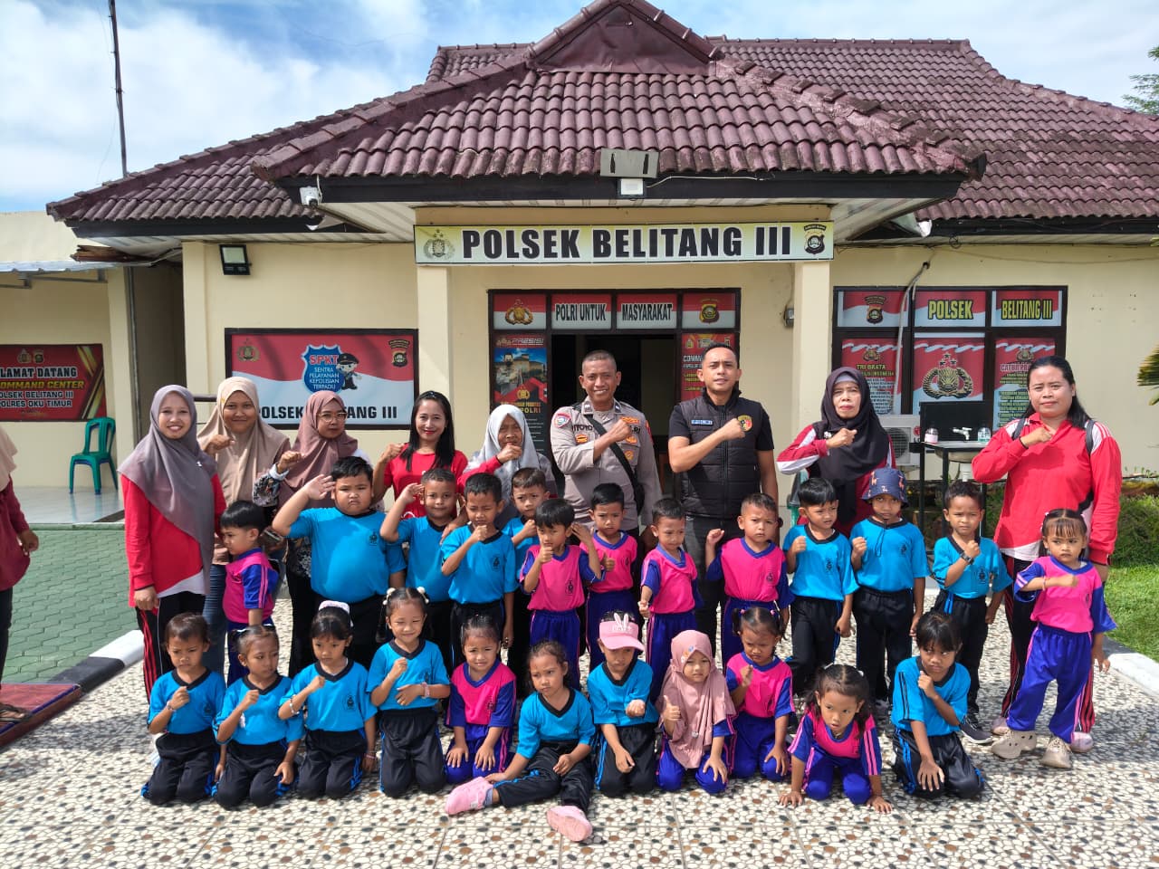 BELITANG III – Polsek Belitang III menerima kunjungan Edukatif Siswa – siswi TK (Taman Kanak-kanak) desa Nusa Tunggal Kec. Belitang III Kab. OKU Timur di Mapolsek Belitang III. Kamis (13November 2025)
