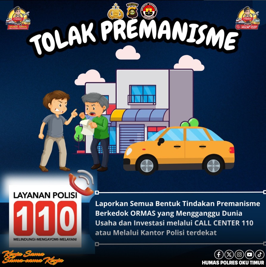 Polres OKU Timur menghimbau kepada seluruh masyarakat Kabupaten OKU Timur untuk tidak segan untuk melaporakan jika melihat atau mengetahui tentang adanya kegiatan premanisme disekitar tempat tinggal kita.